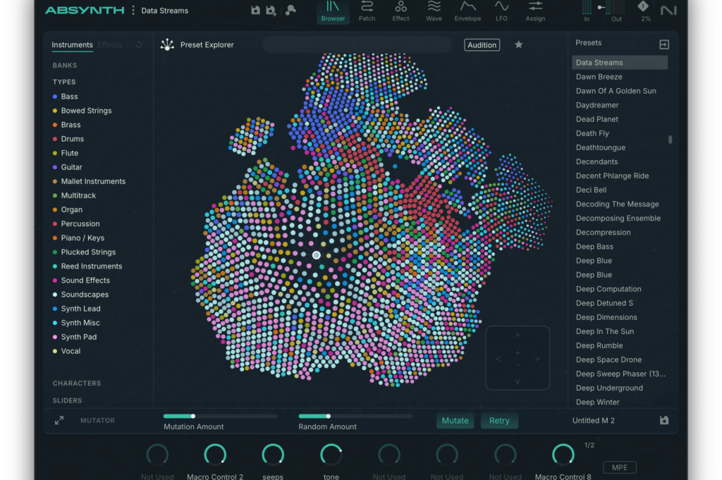 The most immediately noticeable change to Absynth, though, is the new AI-assisted preset explorer. Instead of just a list of sounds for you to click through, Absynth defaults to a collection of points organized roughly by vibe. It’s not unlike Obsidian’s graph view or the XO sample manager. Personally, I’m not a huge fan. It’s ok for finding surprises in the library of over 2,000 presets. But it makes it difficult to keep track of what I’ve auditioned, what is new to me.