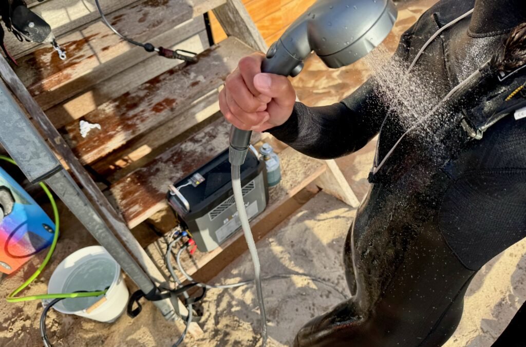 Alternatively, you can save gas with a long press on the pump button to put the shower into cold water mode — ideal for rinsing off your mountain bike, hiking shoes, or wet suit, for example.