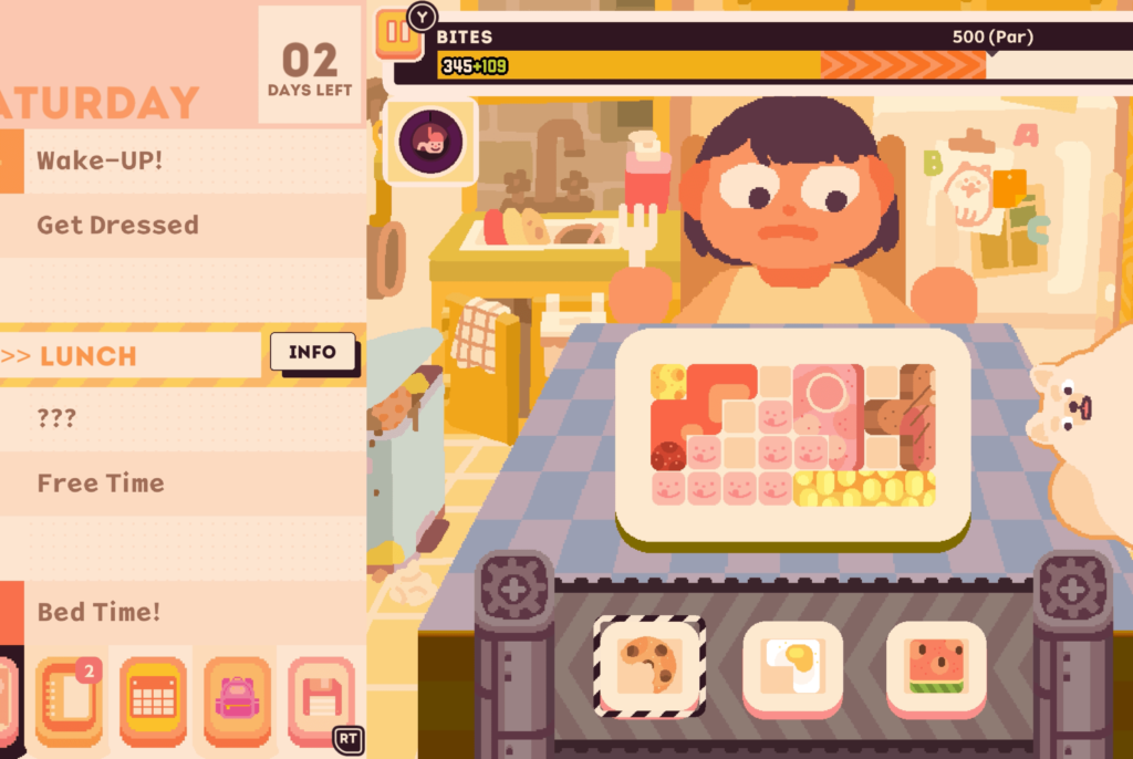 Food in Consume Me — tomatoes, kale, and pasta rendered as Tetris blocks — are assigned “bites,” a stand-in for calories. Jenny’s (the character, not the developer, who we’ll refer to using her last name, Hsia) lunch ritual is organizing these blocks on a plate, carefully selecting the pieces, and arranging them to both keep her full but stay under her self-imposed bite limit. It’s the sort of math that’s familiar in video games, but flipped upside down by the influence of controlled, disordered eating. This is no glossy-egged, open-faced croque madame from Final Fantasy XV, a dish that is as beautiful as it is powerful.
