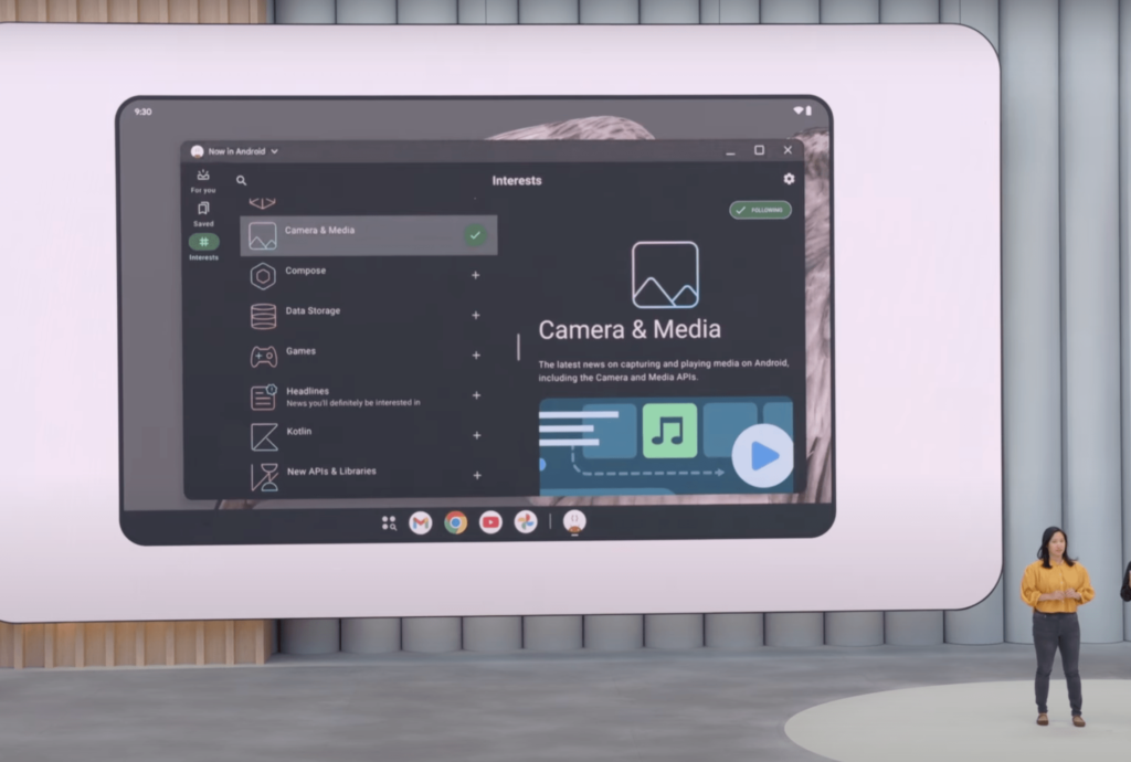 A demo during the presentation revealed a Samsung DeX-like layout, with apps like Gmail, Chrome, YouTube, and Google Photos centered in the taskbar at the bottom of the screen. It also showed how Android 16’s adaptive apps can move and stretch across the screen. The time sits at the top-left corner of the screen, with the Wi-Fi signal and battery on the right.