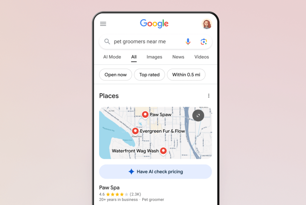Google first started testing this feature in January, and it’s still only available for certain kinds of businesses, like pet groomers, dry cleaners, and auto shops. When you search for one of these services, like a pet groomer, Google will display a new “have AI check pricing” prompt beneath the business listing.