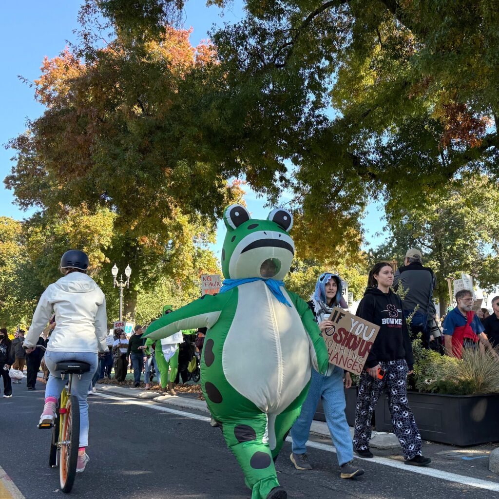 In Portland, June’s protests were dominated by American flags and the symbol of a crossed-out crown. The October protests, on the other hand, were all about the frog. All throughout the crowd, there were inflatable frog costumes of varying degrees of quality — mostly green, with a couple of pink frogs and Halloween-themed skeleton frogs. There were many other inflatables, too — unicorns, sharks, dinosaurs, chickens, squirrels, flamingos, aliens, Garfield — but the frog had become ubiquitous in all forms. There were people in frog kigurumi onesies, people in frog masks and frog hats and little paper frog cutouts taped onto beanies. Signs and t-shirts featured frogs and words like “ribbet” and “hop.” A trio of inflatable frogs posed for photos by the waterfront trail; protesters crowded around them with their phones, as eager as children at Disneyland waiting to take photos with Mickey Mouse.