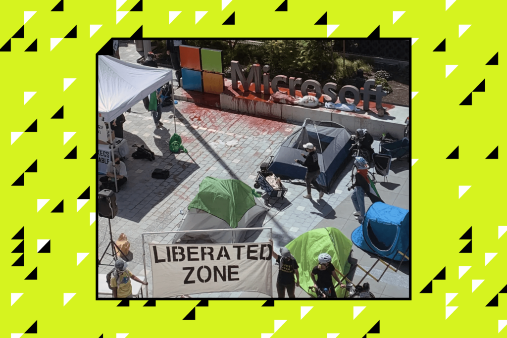 Days later, protesters arrived at Microsoft’s headquarters to start an encampment. A group of current and former Microsoft employees, as well as community members, took over a plaza at Microsoft’s headquarters. Protesters were moved to a public area outside of Microsoft’s campus on the first day of those protests last week, but things got heated when they returned on the second day.