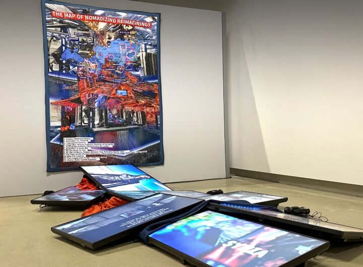Video screens glow softly from the floor, looping footage of salt lakes, steppe villages, and decaying nuclear...