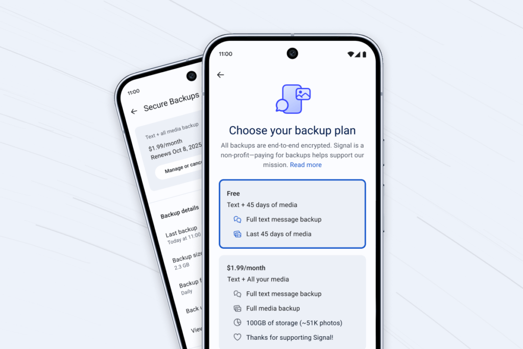 Signal is launching its first paid feature: the ability to make secure, end-to-end encrypted backups of your media history older than 45 days and of your text message history for $1.99 per month.