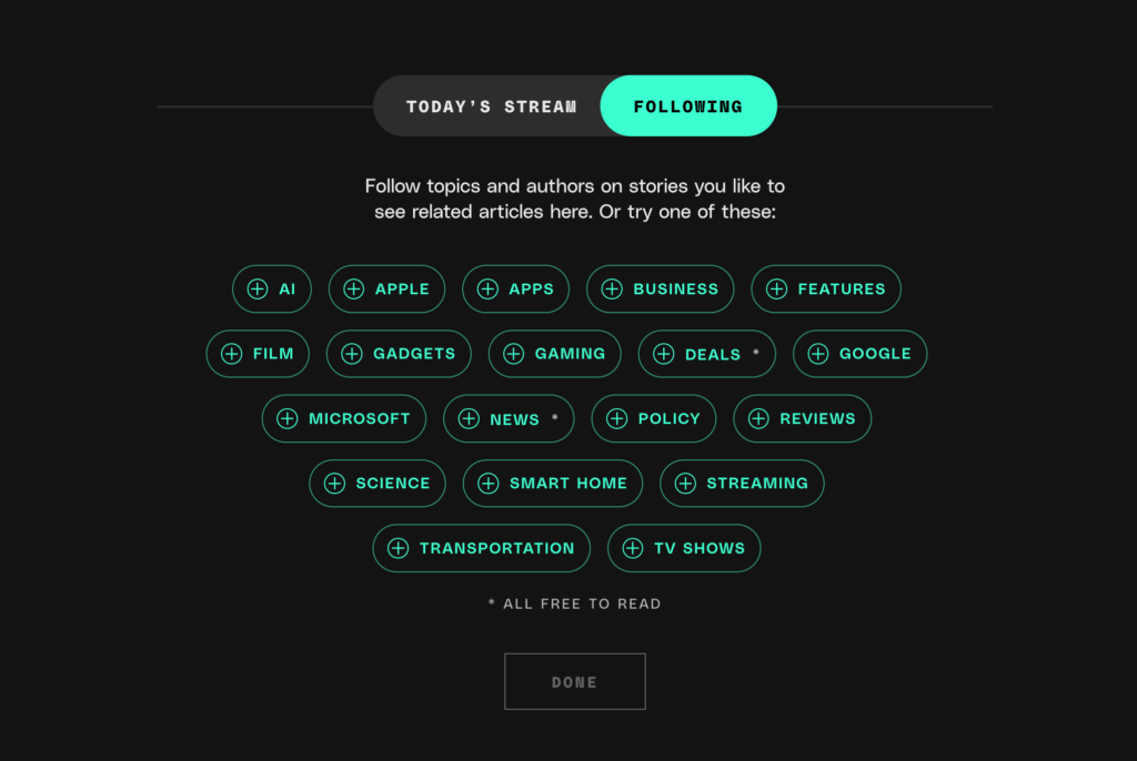 On the front page, you’ll now see a toggle that says “Following” at the top of our news feed. Click it, and you’ll be able to start choosing the topics you want to populate your own custom feed. You’ll also see “+” buttons around the website, which let you add new authors and topics as you come across them. You’ll need to sign up for a Verge account to access the features, but they’re all available for free — subscribers and non-subscribers alike.