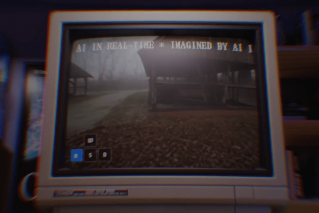 In motion, Odyssey’s interactive videos feel like walking through a blurry version of Google Street View. You can walk around the startup’s real-time generated worlds using the WASD keys as though it were a game. There are a handful of different worlds you can switch between, like a wooded area with a cabin, a shopping mall, and a parking lot in front of a large building. They’re a little different each time, since the system is regenerating what’s in your vision each time. But the picture quality is generally pretty fuzzy.